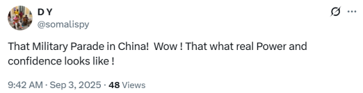 阅兵活动开始后,有网友在X平台发帖称,“中国的阅兵式!哇!这才是真正的力量与自信!”↓
