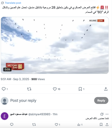 有网友发视频展示了本次阅兵式中26架直升机在空中组成数字“80”的情景。对此,一名阿拉伯地区网友说:“我们希望能够现场参观这次阅兵。”↓
